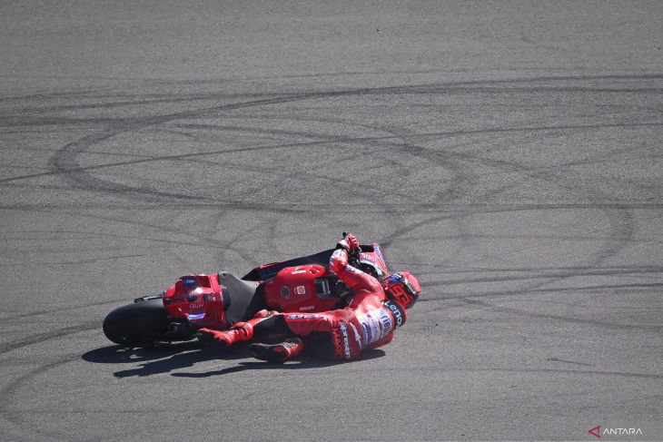 Pembalap Ducati Lenovo Team Marc Marquez terjatuh dalam sesi practice MotoGP Indonesia 2025 di tikungan 11 Sirkuit Internasional Pertamina Mandalika, Lombok Tengah, Nusa Tenggara Barat, Jumat (3/10/2025). Pembalap Aprilia, Marco Bezzecchi, menjadi yang tercepat dalam sesi tersebut dengan catatan waktu tercepat satu menit 29,240 detik, sementara pembalap BK8 Gresini Racing MotoGP Fermin Aldeguer berada di peringkat dua dengan cacatan waktu 0,408 detik lebih lambat dari Bezzecchi. ANTARAFOTO/Aditya Pradana Putra/nym.